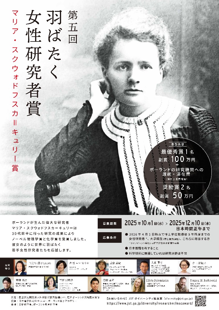 【公募情報(~12/10)】羽ばたく女性研究者賞(マリア・スクウォドフスカ=キュリー賞)